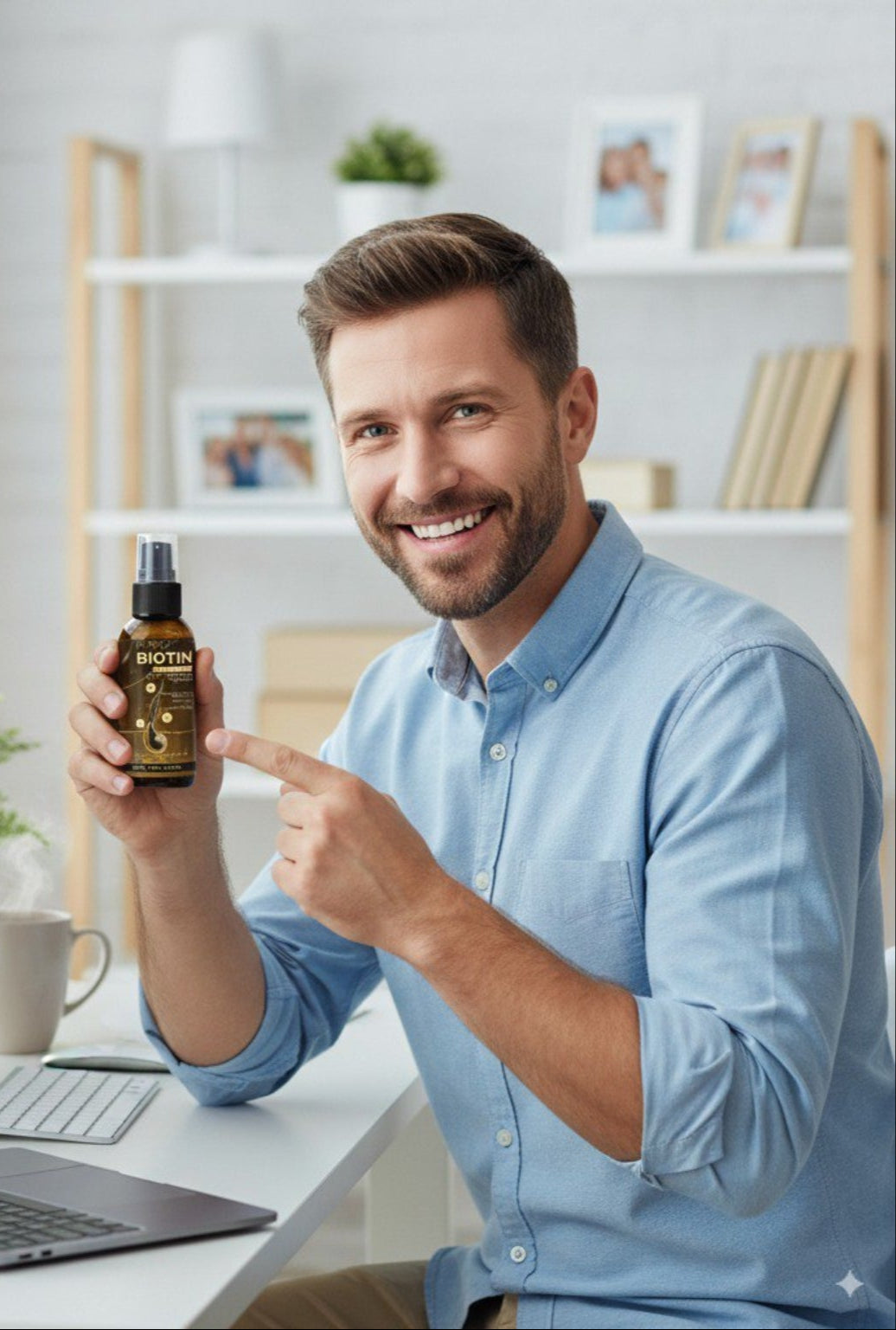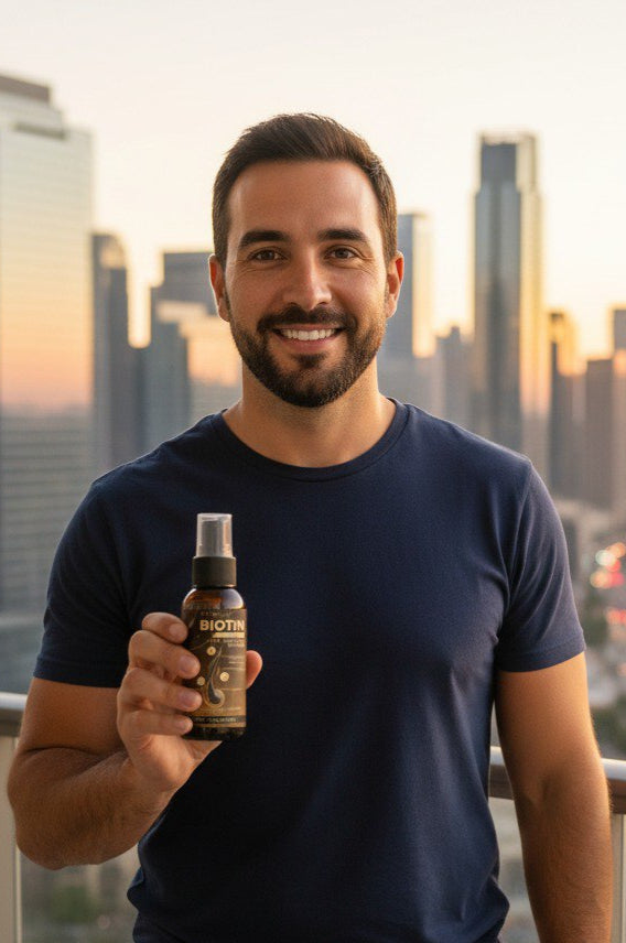 Biotin, also known as Vitamin B7 or Vitamin H, is a vital nutrient for maintaining healthy hair, skin, and nails. As the key ingredient in our hair growth spray, it boosts keratin production, strengthens follicles, and enhances elasticity, leading to faster growth and less breakage. The result? Shinier, thicker, more resilient strands that bring back the confidence thinning hair has taken away.